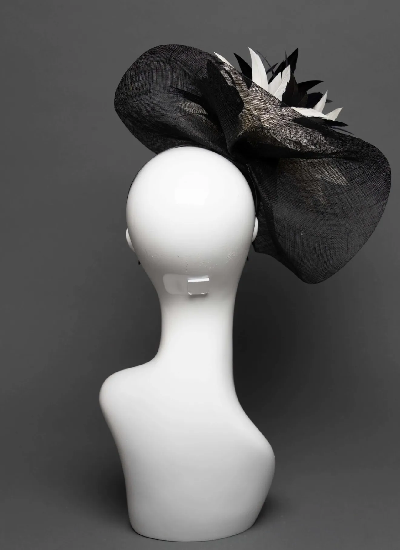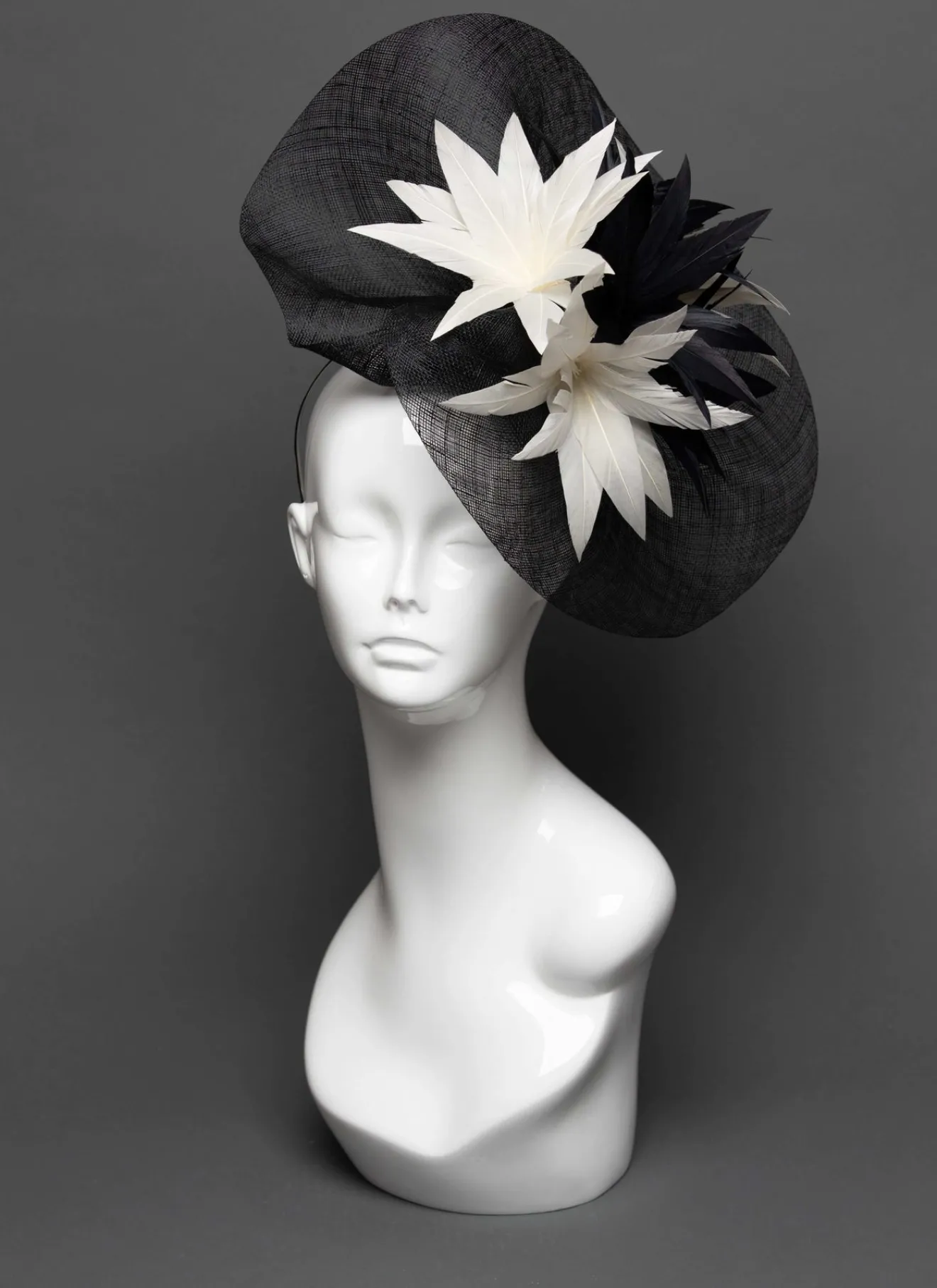 Black hand-sculpted sinamay fascinator with a flower made from black and white goose feathers.