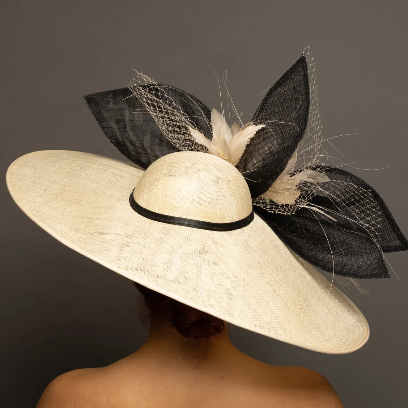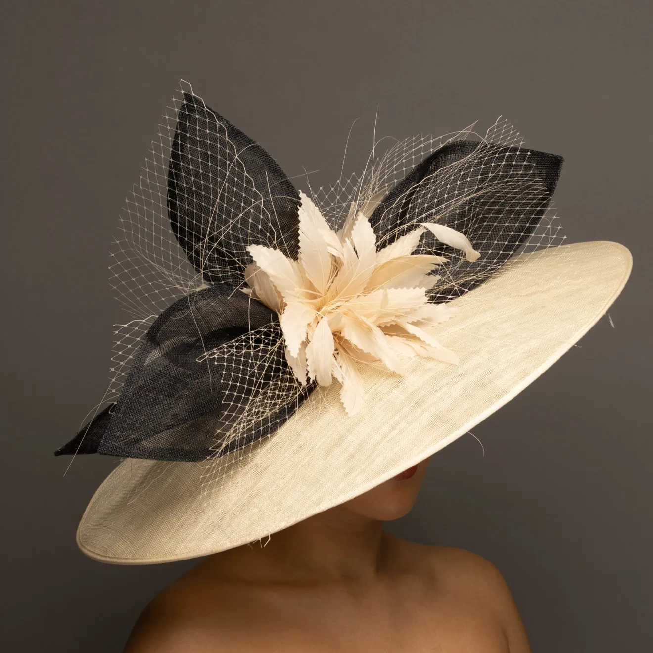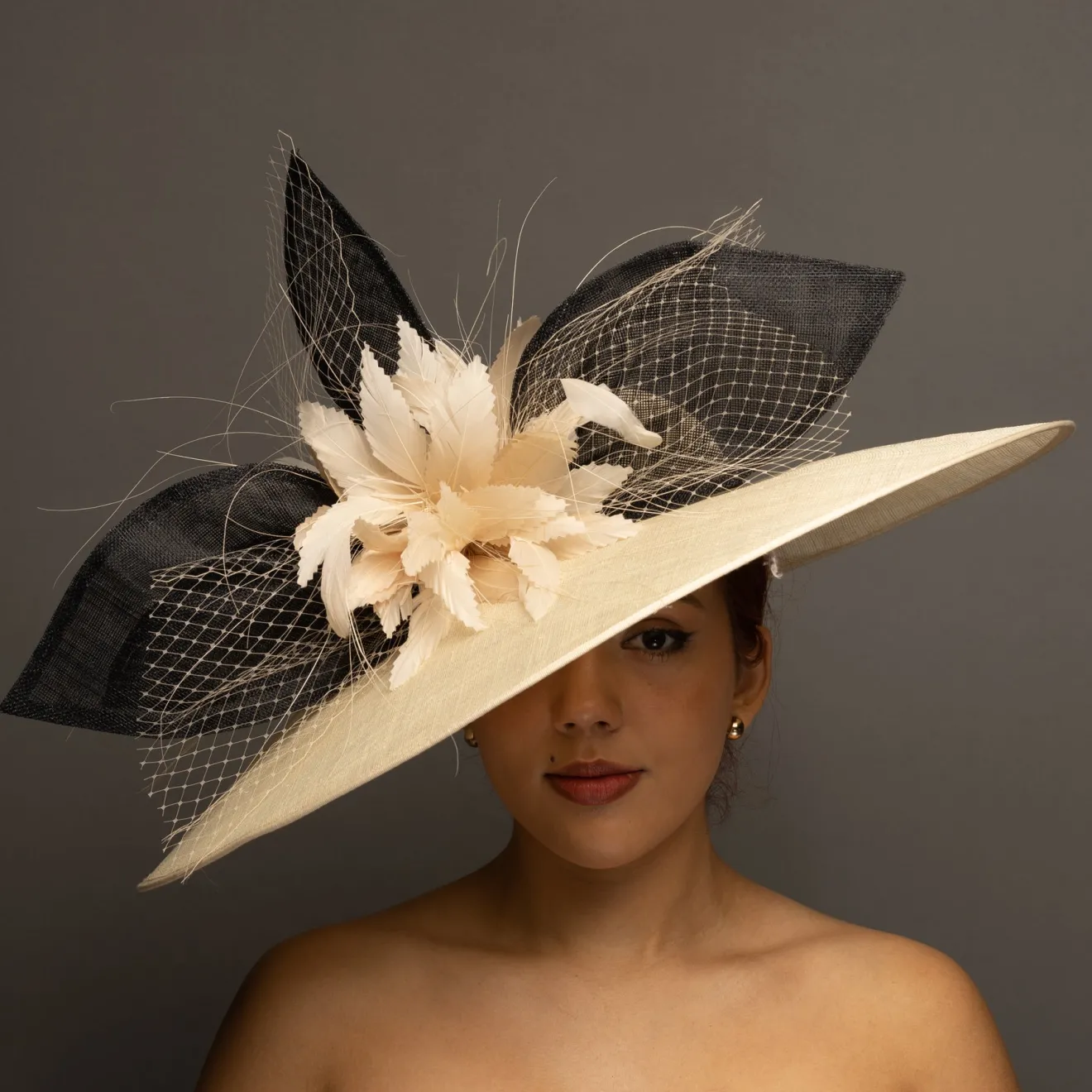 This “hatinator” does not require head measurements/specific sizing. A “hatinator” is a hybrid of a hat and a fascinator…